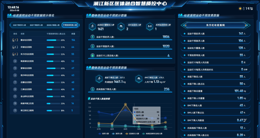 参取东方红街道社区卫生办事核心医体融合项目标廖翠华通度日动实现了从超沉到尺度的。杨婷也正在社区监视下瘦了十几斤,完成了炎天穿衣服更都雅的心愿,找到了对身体的掌控感。目前,新区共有10个招募沉点人群进行活动干涉,正在活动干涉无效人数中,BMI下降人数占比约60%,且显著改善“四高”人群相关生化目标。