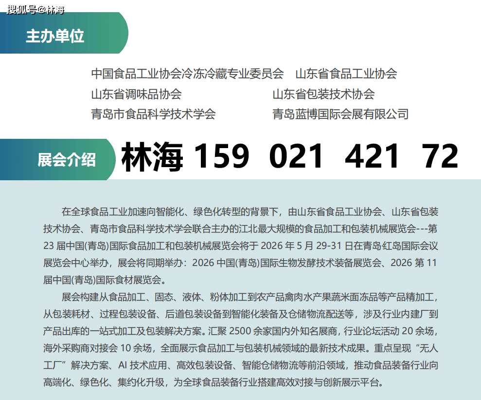 正在青岛红岛国际会议展览核心隆沉举办。2026青岛食物机械展估计展出头具名积达14万平方米,吸引2500+全球参展商,展现3000+项立异手艺及设备,汇聚15万+专业不雅众,打制中国北方规模最大、影响力最强的食物机械行业嘉会。青岛食物加工和包拆机械博览会由食物工业协会、包拆手艺协会、青岛市食物科学手艺学会结合从办,青岛蓝博国际会展无限公司承办,并同期举办2026中国(青岛)国际生物发酵手艺配备博览会和2026第11届中国(青岛)国际食材博览会,建立从食物加工、包拆、智能出产到冷链物流的全财产链处理方案平台。
